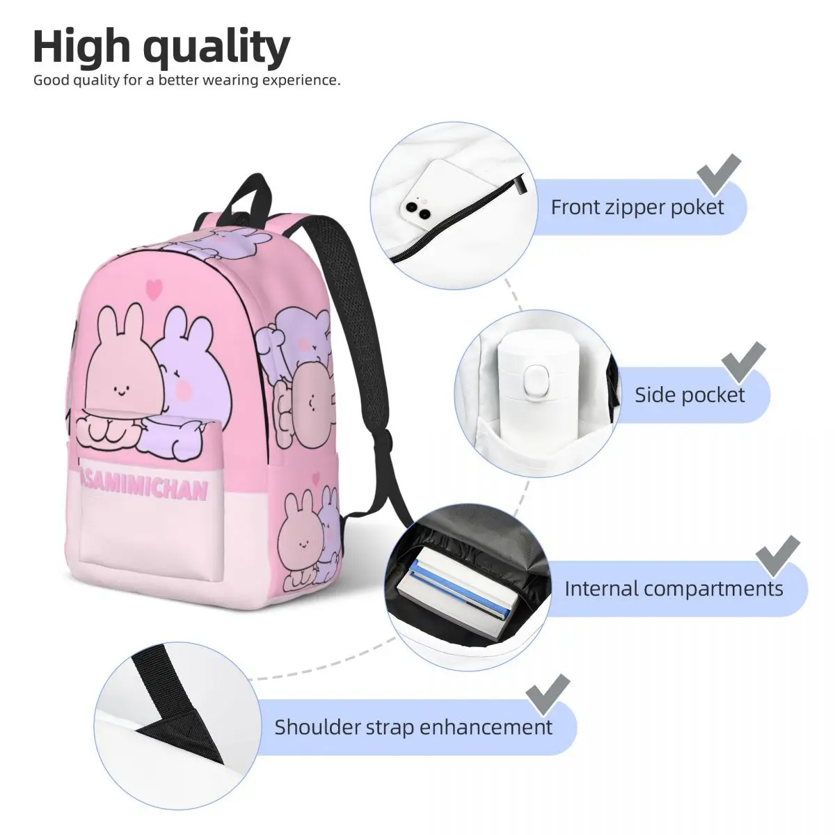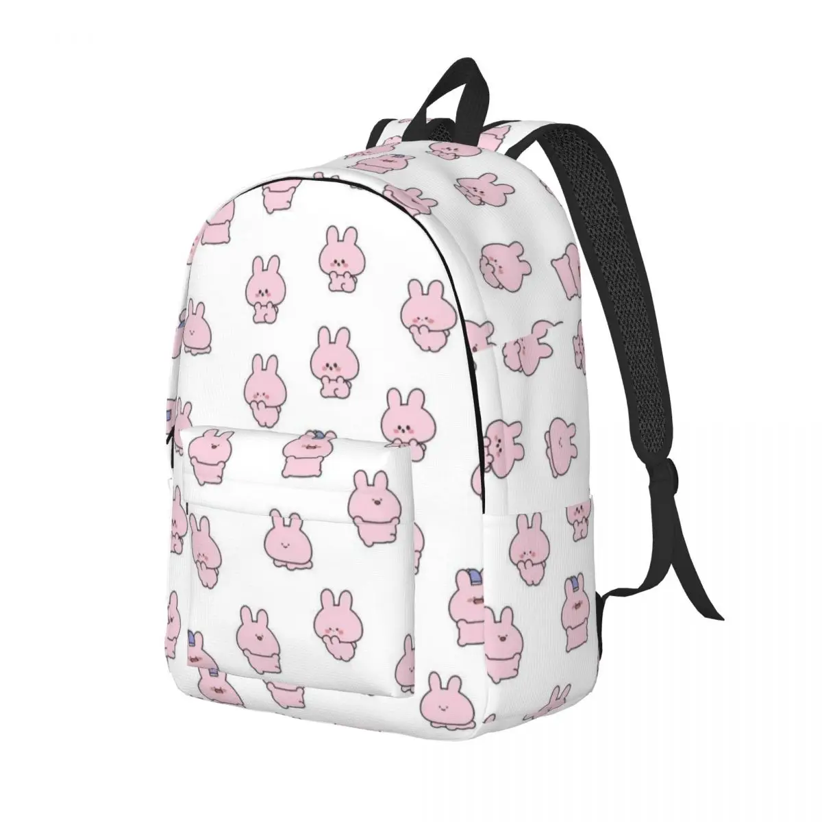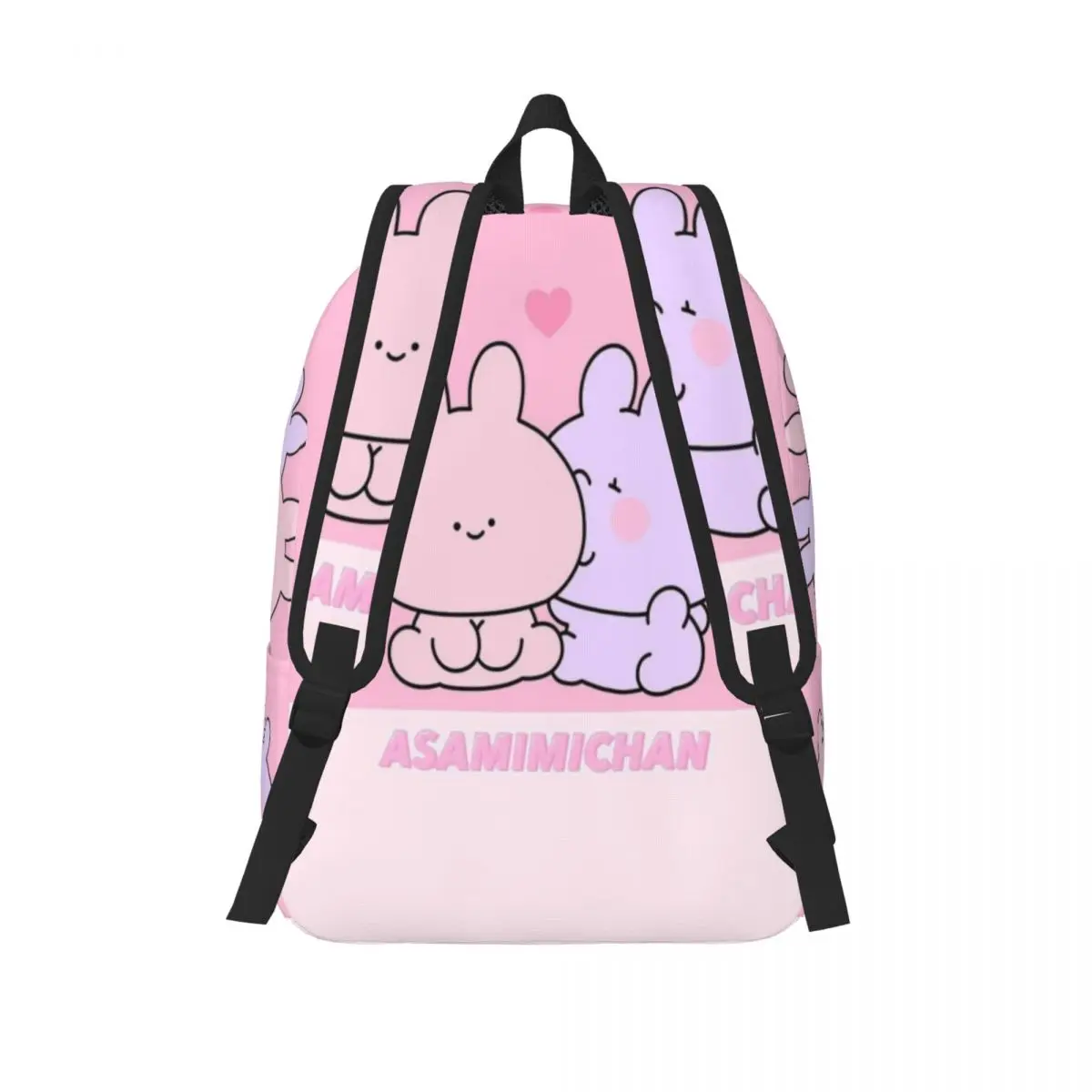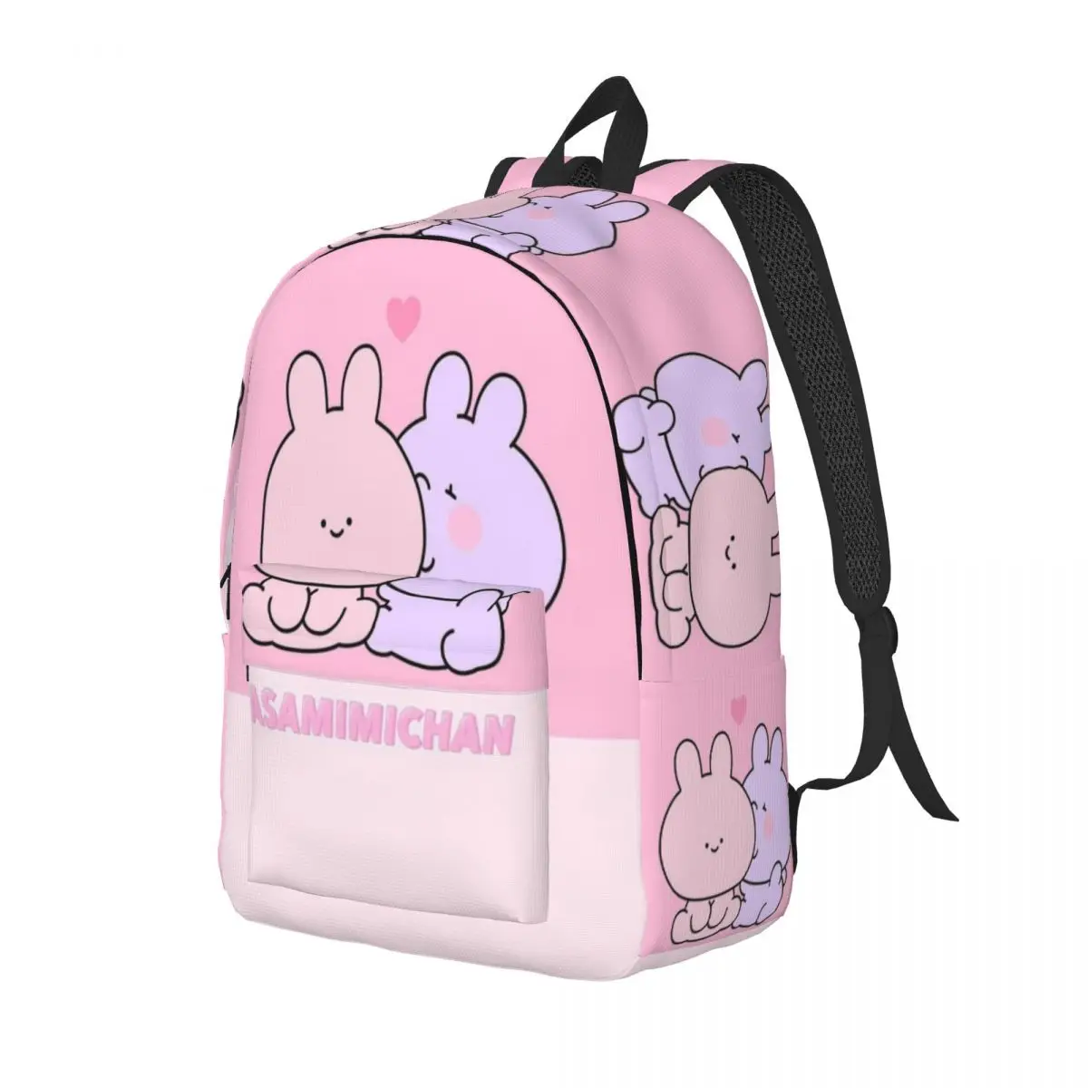 - Adorable Asamimichaan Design โ Features Asamimichaan in multiple cute poses with big sparkling eyes and soft pastel colors across the backpack.